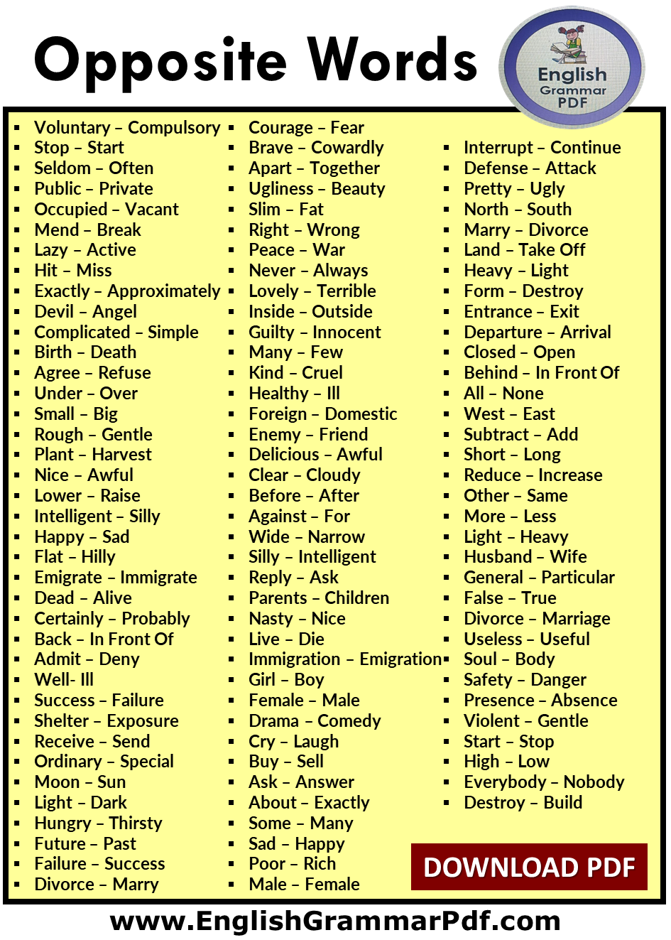 Download 1100 Opposite Words, Definition and Example Sentences in PDF